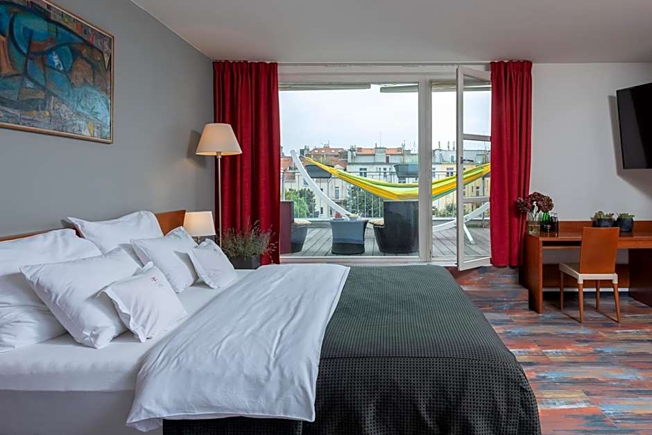 The romantic suite has a stand alone bath, a comfortable double bed and a spacious shower. For relaxing there is a hammock on the terrace overlooking the rooftops of Letna.